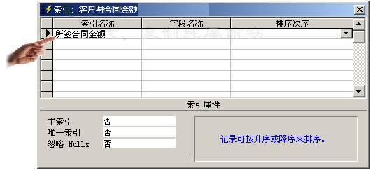“索引名稱”僅是索引的標識,可以使用索引字段的名稱來命名,或使用具有某種含義的字符串。如,本例將建立“合同金額”索引,以便于以后按合同金額的大小排序來瀏覽數據記錄,所以給出了圖35中所示的索引名稱。