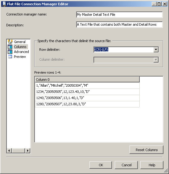 我們將建立一個flat file connection manager指向該文件,在這里,我并不打算把行拆分出來,暫時把整行讀在一列中