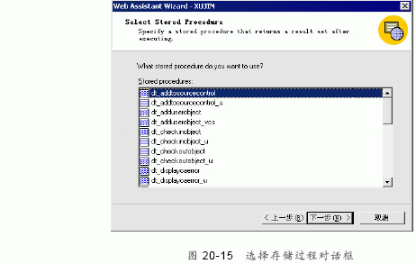 如果選擇“result set s of a stored procedure i select” 方式,使用存儲過程查詢數(shù)據(jù),則出現(xiàn)如圖20-15 所示的選擇存儲過程對話框。如果所選擇的存儲過程需要指定參數(shù)的值,那么在選擇好存儲過程后單擊“下一步”按鈕,就會出現(xiàn)如圖20-16 所示的指定參數(shù)值對話框。