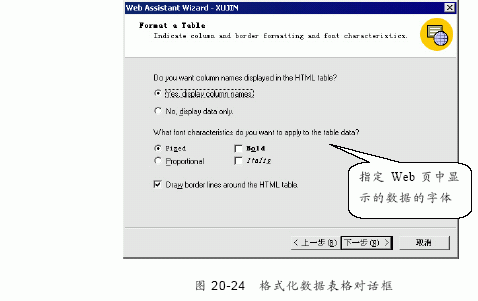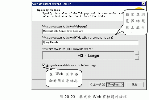 (7) 單擊“下一步”按鈕。如果選擇前三種更新方式,則出現(xiàn)如圖20-19 所示的指定web 頁名稱及存儲位置對話框。 如果選擇“when the sql server data changes” 方式,則出現(xiàn)如圖20-20 所示的選擇所要監(jiān)視的表和列對話框。此時,如果更改所選擇表的指定列的數(shù)據(jù),則系統(tǒng)會自動更新所發(fā)布的web 頁。單擊“下一步”按鈕,則出現(xiàn)如圖20-19 所示的發(fā)布web 頁對話框。 如果選擇“at regularly scheduled intervals” 方式,則出現(xiàn)如圖20-21 所示的指定進行更新的時間間隔對話框。以后每到規(guī)定的時間就會進行自動更新。單擊“下一步”按鈕,則出現(xiàn)如圖20-19 所示的發(fā)布web 頁對話框。 (8) 在圖20-19 中指定了所發(fā)布的web 頁的名稱和存儲路徑后,單擊“下一步” 按鈕,接下來出現(xiàn)格式化web 頁對話框,如圖20-22 所示。您可以利用web assistant 來格式化web 頁,也可以選擇web 頁模板來定制所要進行發(fā)布的 web 頁(如果選擇使用模版則會跳過第9 10 11 三個步驟)。 (9) 在圖20-22 中選擇“yes help me format the web page”, 單擊“下一步” 按鈕,接下來出現(xiàn)格式化web 頁標題對話框,如圖20-23 所示。單擊“下一步”按鈕。 (10) 接下來出現(xiàn)格式化數(shù)據(jù)表格對話框,如圖20-24 所示,單擊“下一步”按鈕。 (11) 接下來出現(xiàn)添加超鏈接對話框,如圖20-25 所示。單擊“下一步”按鈕。 (12) 接下來出現(xiàn)限制表格數(shù)據(jù)行對話框,如圖20-26 所示。單擊“下一步”按鈕。 (13) 接下來出現(xiàn)完成web assistant wizard 對話框,如圖20-27 所示。單擊“下一步”按鈕。
