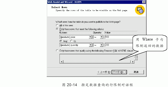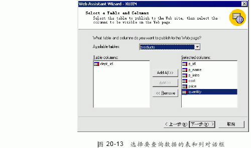 (5) 單擊"下一步"按鈕.如果選擇“data from the tables and columns that i select” 方式,對指定的單個表的列進行查詢,則出現(xiàn)如圖20-13 所示的選擇要查詢數(shù)據(jù)的表和列對話框。單擊“下一步”按鈕,則會出現(xiàn)如圖20-14 所示的指定數(shù)據(jù)查詢的行限制對話框,可以限制返回的數(shù)據(jù)。