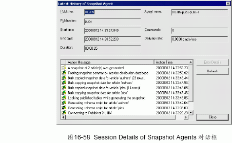 在sql server 中,復(fù)制是功能最為強(qiáng)大而又最為復(fù)雜的組件,所以在具體的應(yīng)用中復(fù)制出現(xiàn)錯誤是難以避免的事情。但同時令人欣慰的是,sql server 提供了復(fù)制管理工具——復(fù)制監(jiān)視器來幫助dba 查出復(fù)制錯誤發(fā)生的原因。利用復(fù)制監(jiān)視器可以: 瀏覽所有的出版者出版物以及由該分發(fā)者所支持的訂購; 瀏覽復(fù)制代理的狀態(tài)信息和歷史; 監(jiān)視與復(fù)制事務(wù)有關(guān)的復(fù)制警報。 同時利用復(fù)制監(jiān)視器可約嗍涌煺沾懟⑷罩駒畝鏈懟⒎址⒋懟⒑喜⒋懟?br> 注意:只有在服務(wù)器扮演分發(fā)者角色,且當(dāng)前用戶具有sysadmin角色時,復(fù)制臨視器才能激活。 如果準(zhǔn)備監(jiān)視快照代理的活動狀況,請執(zhí)行以下步驟; (1) 啟動sql server enterprise manager, 登錄到指定的服務(wù)器,順次打開 replication monitor, agents 文件夾。 (2) 選中snapshot agents, 此時在右面窗格中顯示已創(chuàng)建的快照代理。 (3) 右擊準(zhǔn)備查看的代理,在彈出菜單中選擇agent history 選項,打開snapshot agent history 對話框,如圖16-57 所示; (4) 單擊session details 按鈕,打開session details of snapshot agents 對話框,如圖16-58 所示。在該對話框中能了解到目前為止快照代理都執(zhí)行了哪些處理、運(yùn)行的起始時間等信息。