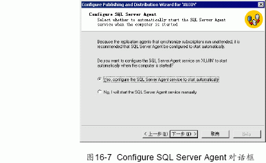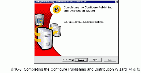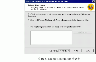 16.2.1 創建服務器角色和分發數據庫 創建服務器角色是指在復制過程中某一服務器是作為出版者、分發者還是作為訂購者s捎赟ql server 可以扮演一個或多個角色,所以我們必須指定由哪個服務器來扮演哪些角色。 分發數據庫(distribution database) 用來存儲復制給訂購者的所有事務以及出版者與訂購者的同步信息。在分發數據庫有很多與復制有關的系統表。進行復制前必須首先創建分發數據庫(與系統有關的系統表會自動生成),同時指定出版者、出版數據庫、分發者、訂購者。使用sql server enterprise manager 來創建分發數據庫主要按以下步驟: (1) 啟動sql server enterprise manager, 選中準備扮演出版者角色的服務器。 (2) 在主菜單上選擇tools 菜單項在下拉菜單中再選擇replication 選項,選中configure publishing, subscribers, and distribution 選項,此時會彈出welcome to the configure publishing and distribution wizard 對話框。如圖16-5 所示。 (3) 從中可以得知通過該向導能夠實現哪些復制配置,單擊“下一步”繼續操作,此時彈出select distributor 對話框。如圖16-6 所示。 在該對話框中可以使用默認選項make ‘xujin’ its own distributor; sql server will create a distribution database and log 來指定當前出版者服務器扮演分發者角色,若選擇此選項,則會在分發者服務器上創建一個分發數據庫和日志。如果選擇另外一個選項,應該注意被選定的服務器必須已被配置為分發者且已經創建了分發數據庫。在此使用默認選項, (4) 單擊“下一步”,此時彈出configure sql server agent 對話框。如圖16-7 所示。選擇yes 選項表示自動啟動sql server agent, 選擇no 選項,則表示手工啟動sql server agent。 (5) 單擊“下一步”,彈出customize the configuration 對話框。在該對話框內如果選擇默認的選項。即no, use the following default setting ,那么sql server 將自動配置復制選項,它將把當前服務器作為分發者,分發數據庫和事務日志被放在/mssql/data 目錄下,所有登記的服務器都被選為訂購者。您也可以選擇自定義選項,即yes, let’s…. 選項來對分發者、出版者、訂購者、分發數據庫進行配置(我們將在下一節對其進行具體的介紹)。在這里我們選擇默認選項。 (6) 單擊“下一步”,然后在打開窗口(如圖16-8 所示)中單擊“finish” 按鈕,此時會彈出一個報告窗口configure publishing and distribution on ‘server _name’ 來顯示創建進度。通過該窗口能了解sql server 完成了哪些工作。