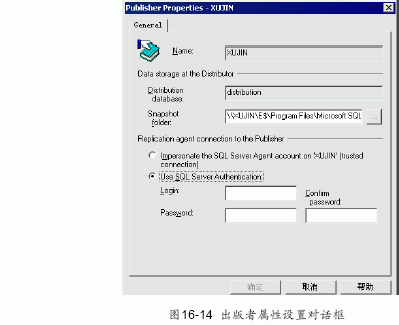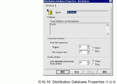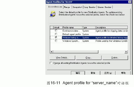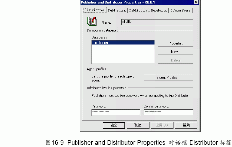 1 配置分發選項 利用sql server enterprise manager 執行配置分發選項的步驟為: (1) 啟動sql server enterprise manager, 選中要進行分發選項配置的分發者服務器。 (3) 單擊標簽頁上的“new”, 按鈕將添加新的分發數據庫,或使用“delete” 從 distribution database 選項欄的database 框中選中刪除一個已存在的分發數據庫,若要對分發數據庫進行屬性設置,則首先選中該分發數據庫,然后單擊 properties 按鈕,打開distribution properties 對話框,如圖16-10 所示。 該對話框提供了以下信息:分發數據庫名稱;在publishers 下的多行編輯框內顯示使用該分發數據庫的出版者;transaction retention 用來設定事務保存在分發數據庫中最短時間與最長時間(該選項對于備份和恢復分發數據庫很有意義);history retention 用來設定復制性能歷史記錄的保存在分發數據庫的時間。如果選用的單位為小時,則保存時間的取值范圍為0 至9999 ;如果單位為天,則取值范圍為0 至416。 (4) 單擊agent profiles 選項欄中的agent profile 按鈕,打開agent profile for “server_name” 對話框,如圖16-11 所示。 該對話框用來對復制代理快照(代理日志、閱讀代理、分發代理、合并代理、閱讀日志代理)運行參數進行設置。當創建復制代理時,將生成與其相關的agent profile, 它由分發者維護。復制代理每次啟動時都要從agent profile 中讀取信息,來確定自己的運行方式。通過copy 按鈕,可以創建新的agent profile; 通過 view details 可以查看或修改各參數的值,如圖16-12 所示;通過 delete 可以刪除agent profile。 2 配置出版選項 在配置完分發選項后,就可以配置出版選項來指定哪個出版者將使用已創建的分發者和分發數據庫。sql server 允許多個出版者使用同一個分發數據庫。如果出版者是一臺遠程服務器,那么它必須有訪問分發數據庫的權限。使用sql server enterprise manager 來允許出版者使用分發數據庫的步驟如下: (1) 啟動sql server enterprise manager, 選中分發者服務器。 (2) 在主菜單中選擇tools, 在下拉菜單中選擇replication, 然后選擇configure publishing, subscribers and distribution 選項,此時會打開publisher and distributor properties 對話框,選中publisher 標簽。如圖16-13 所示。 (3) 通過選中server 表格內的空白框來指定該出版者是否使用當前分發數據庫。 (4) 單擊分發數據庫旁的方框按鈕,打開如圖16-14 所示的出版者屬性設置對話框。進行其它選項的設置。