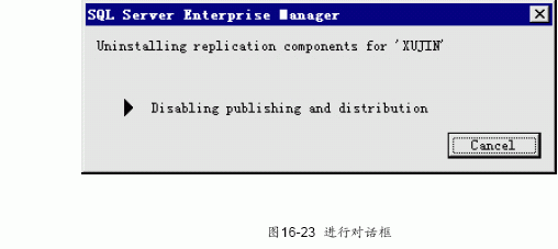 如果此向導能登錄到出版者,則在禁用出版者之前會刪除所有出版物;如果不能,則雖然禁用出版者但是出版數據仍存在于以前的出版者上,必須使用手工操作來刪除。 使用sql server enterprise manager 來禁用一服務器扮演分發者角色需執行以下步驟: (1) 啟動sql server enterprise manager, 選中分發者服務器。 (2) 在主菜單中選擇tools, 在下拉菜單中選擇replication, 然后選擇disable publishing…. 選項,此時會打開disable publishing and distribution wizard startup 對話框,如圖16-21 所示,從中可以看到該向導能夠實現哪些功能。 (3) 單擊“下一步”按鈕,打開disable publishing 對話框。如圖16-22 所示。在該對話框內如果選擇yes, disable publishing on…..選項,則會禁用分發者以及出版者,并且刪除分發數據庫和出版者上的出版物(在有些情況下仍保留分發數據庫)。單擊“下一步”按鈕,sql server 將按要求執行相關處理。如果選擇no, continue to use “distributor” as a distributor 選項,則不會進行任何處理。 (4) 單擊“下一步”按鈕,sql server 將按要求執行相關處理,同時彈出一個進行對話框,如圖16-23 所示。 (5) 通過單擊“cancel” 可以取消操作,單擊“finish”, 完成整個向導。