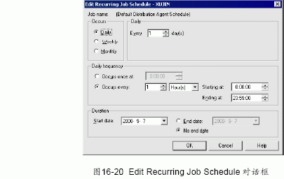 (6)選中schedules標簽,出現如圖16-19所示的對話框。 使用該對話框來設置分發代理或合并代理運行的缺省時間。在默認情況下為continuously。若選擇at the following scheduled times,則單擊change按鈕會打開edit recurring job schedule對話框。如圖16-20所示。在該對話框可對代理運行的時候表進行設置。