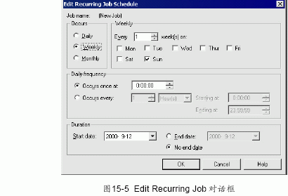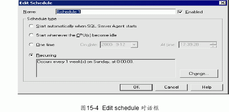 (7) 在name 中輸入備份安排任務(wù)名字,默認(rèn)為schedule1。 在schedule type選項(xiàng)欄中單擊任意單選按鈕(其中各選項(xiàng)含義見第十七章sql serveragent)。 可以單擊change 按鈕來(lái)改變當(dāng)前默認(rèn)的備份時(shí)間設(shè)置。然后會(huì)彈出edit recurring job 對(duì)話框,如圖15-5 所示。
