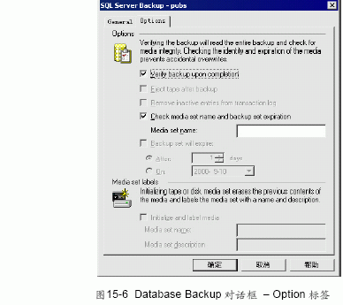 (9) 在database backup 對(duì)話框中選擇option 標(biāo)簽來(lái)進(jìn)行附加設(shè)置選擇option標(biāo)簽后的對(duì)話框如圖15-6 所示。