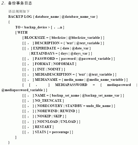 注意:如果您所采用的備份策略是:進(jìn)行數(shù)據(jù)庫(kù)完整備份,并且不依賴事務(wù)日志備份而進(jìn)行數(shù)據(jù)庫(kù)恢復(fù),那么可以在進(jìn)行完整數(shù)據(jù)庫(kù)備份之后執(zhí)行帶有該選項(xiàng)的backup命令,從而清除掉事務(wù)日志中非活動(dòng)部分。