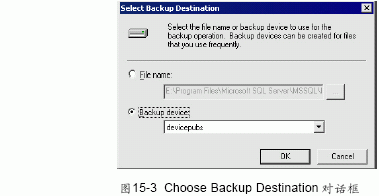 (4) 通過(guò)單擊add 按鈕來(lái)選擇備份設(shè)備。然后彈出choose backup destination對(duì)話框,如圖15-3 所示,可選擇file name 單選按鈕并給出文件名和路經(jīng),也可以選擇backup device 單選按鈕,然后從組合框中選擇備份設(shè)備。