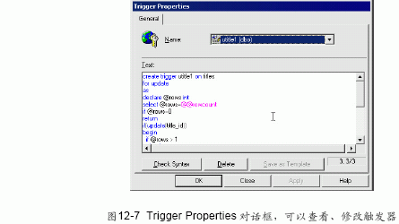 通過enterprise manager 修改觸發器正文的操作步驟與查看觸發器信息一樣。修改完觸發器后要使用check syntax 選項對語句進行檢查。