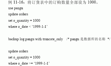 使用update 更新數(shù)據(jù)時(shí),會(huì)將被更新的原數(shù)據(jù)存放到事務(wù)處理日志中。如果所更新的表特別大,則有可能在命令尚未執(zhí)行完時(shí),就將事務(wù)處理日志填滿了。這時(shí)sql server會(huì)生成錯(cuò)誤信息,并將更新過(guò)的數(shù)據(jù)返回原樣。解決此問(wèn)題有兩種辦法:一種是加大事務(wù)處理日志的存儲(chǔ)空間,但這似乎不大合算;另一種是分解更新語(yǔ)句的操作過(guò)程,并及時(shí)清理事務(wù)處理日志。例如,將更新命令分解為兩個(gè)命令,在其間插入backup log 命令將事務(wù)處理日志清除(關(guān)于backup log 命令的詳細(xì)介紹請(qǐng)參見(jiàn)第15 章“備份與恢復(fù)”)。