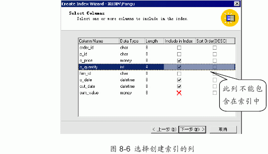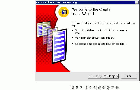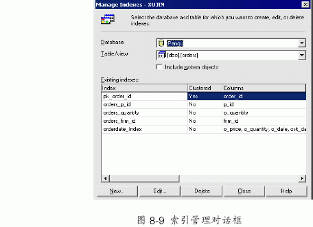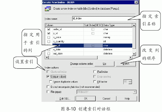 選擇要創建索引的表,單擊右鍵,從快捷菜單中選擇“所有任務(all tasks)”子菜單中的“manage indexes”選項,將會出現如圖8-9 所示的索引管理對話框,其中列出了表中已經存在的索引。選擇“new” 按鈕,進入如圖8-10 所示的創建索引對話框。在圖8-10中,輸入要創建的索引的名稱,再選擇用于創建索引的列,并設置索引的各種選項(有關索引選項的設置,請參考前面講述的create index 命令)。單擊“ok” 按鈕,完成索引的創建。