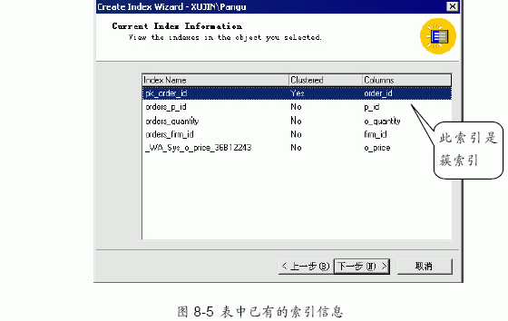 (7) 單擊“下一步”按鈕,出現如圖8-8 所示的完成索引創建界面,在此可以指定所創建索引的名稱,還可以調整組成索引的列的順序。單擊“完成”按鈕,結束索引創建過程。系統會彈出一個創建索引成功信息對話框。