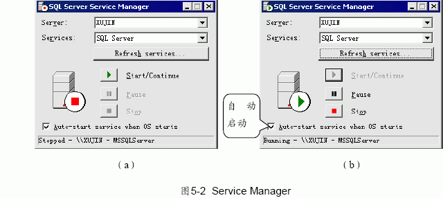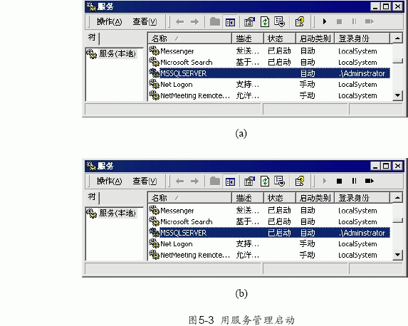 (2)右鍵單擊所要啟動的服務名稱,從快捷菜單中選擇“啟動”選項,就會啟動mssqlserver, 啟動后畫面如圖5-3 (b)。