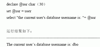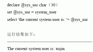 ·user user 函數語法如下: user user 與系統函數user_name() 的功能相同,返回當前用戶的數據庫用戶名.返回值類型為char.
