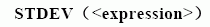 stdev() 函數返回表達式中所有數據的標準差(statistical standard deviation)。表達式通常為表的某一數據類型為numeric 的列(或近似numeric 類型的列,如money 類型,但bit 類型除外)。表達式中的null 值將被忽略。其返回值為float類型。