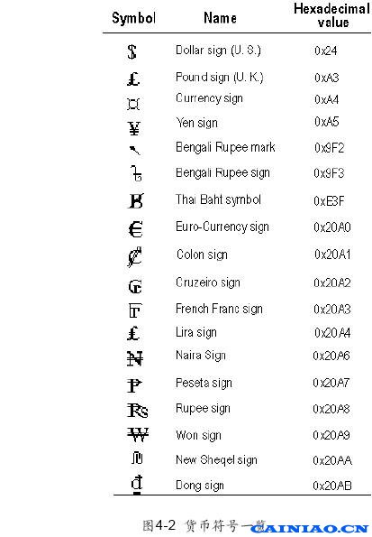 貨幣數據類型用于存儲貨幣值。在使用貨幣數據類型時,應在數據前加上貨幣符號,系統才能辨識其為哪國的貨幣,如果不加貨幣符號,則默認為“¥”。各貨幣符號如圖4-2所示。
