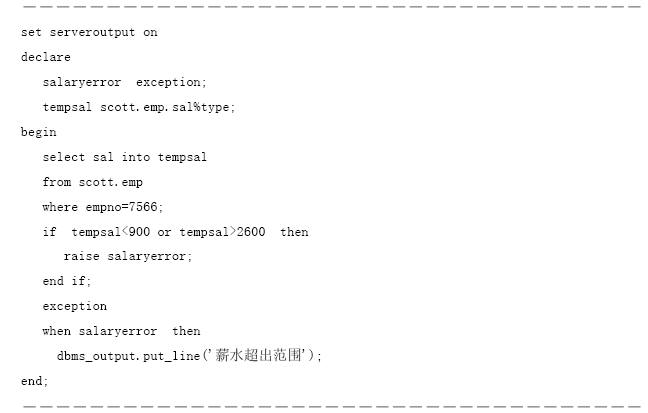下面的pl/sql程序包含了完整的異常處理定義、觸發、處理的過程。定義名為salaryerror的異常,在scott.emp數據表中查找empno=7566的記錄,將其值放入變量tempsal中,判斷tempsal值若不在900和2600之間,說明該員工的薪水有問題,將激活異常處理,提示信息。
