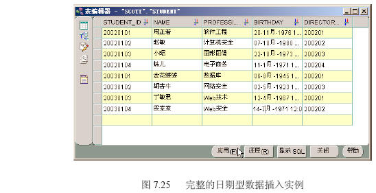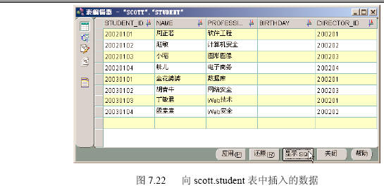 (4)最后完成完整的scott.student數(shù)據(jù)表數(shù)據(jù)的插入,如圖7.25所示。
