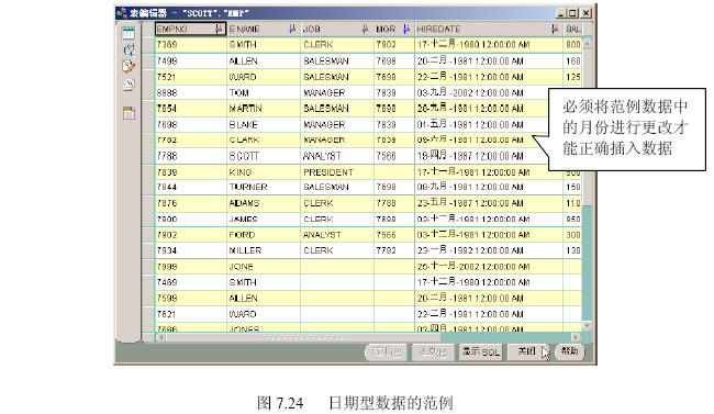 (3)分析出格式還不一定能夠正確錄入日期型數(shù)據(jù)。這里告訴讀者一個(gè)筆者摸索出來(lái)的簡(jiǎn)便的辦法。在scott用戶下有一個(gè)數(shù)據(jù)表emp,其中有一個(gè)hiredate字段是日期型的。