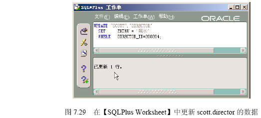 (6)在【sqlplus worksheet】中執(zhí)行下列語(yǔ)句,作用是一樣的。這是通過(guò)主碼director_id來(lái)定位記錄的。這樣的更新語(yǔ)句適合在不同的計(jì)算機(jī)環(huán)境上使用。