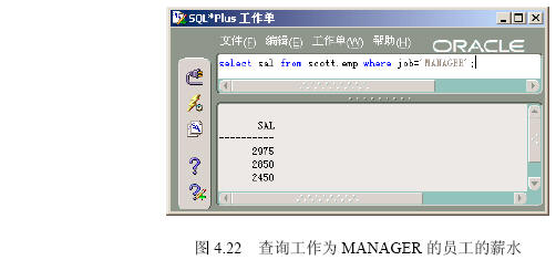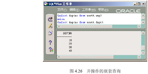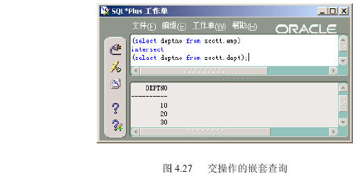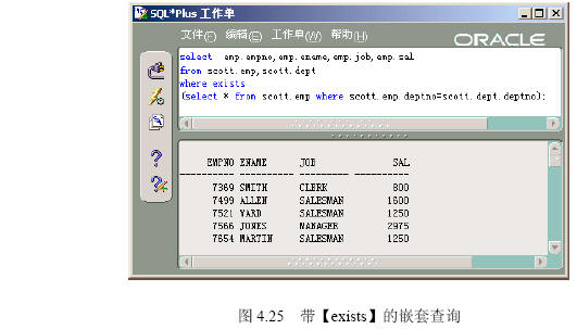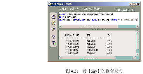 在select查詢語句里可以嵌入select查詢語句,稱為嵌套查詢。有些書上將內嵌的select語句稱為子查詢,子查詢形成的結果又成為父查詢的條件。 子查詢可以嵌套多層,子查詢操作的數據表可以是父查詢不操作的數據表。子查詢中不能有order by分組語句。 4.4.1 簡單嵌套查詢 在【命令編輯區】執行下列語句。 ――――――――――――――――――――――――――――――――――――― select emp.empno,emp.ename,emp.job,emp.sal from scott.emp where sal>=(select sal from scott.emp where ename='ward'); ――――――――――――――――――――――――――――――――――――― 單擊【執行】按鈕,出現如圖4.19所示的結果。 【參見光盤文件】:/第4章/4.4/441.sql。 在這段代碼中,子查詢select sal from scott.emp where ename='ward'的含義是從emp數據表中查詢姓名為ward的員工的薪水,父查詢的含義是要找出emp數據表中薪水大于等于ward的薪水的員工。上面的查詢過程等價于兩步的執行過程。 (1)執行“select sal from scott.emp where ename='ward'”,得出sal=1250; (2)執行“select emp.empno,emp.ename,emp.job,emp.sal from scott.emp where sal>=1250;” 4.4.2 帶【in】的嵌套查詢 在【命令編輯區】執行下列語句。 ――――――――――――――――――――――――――――――――――――― select emp.empno,emp.ename,emp.job,emp.sal from scott.emp where sal in (select sal from scott.emp where ename='ward'); ――――――――――――――――――――――――――――――――――――― 單擊【執行】按鈕,出現如圖4.20所示的結果。 【參見光盤文件】:/第4章/4.4/442.sql。 上述語句完成的是查詢薪水和ward相等的員工,也可以使用【not in】來進行查詢。 4.4.3 帶【any】的嵌套查詢 在【命令編輯區】執行下列語句。 ――――――――――――――――――――――――――――――――――――― select emp.empno,emp.ename,emp.job,emp.sal from scott.emp where sal >any(select sal from scott.emp where job='manager'); ――――――――――――――――――――――――――――――――――――― 單擊【執行】按鈕,出現如圖4.21所示的結果。 【參見光盤文件】:/第4章/4.4/443.sql。 帶any的查詢過程等價于兩步的執行過程。 (1)執行“select sal from scott.emp where job='manager'”,其結果如圖4.22所示。 【參見光盤文件】:/第4章/4.4/443-1.sql。 (2)查詢到3個薪水值2975、2850和2450,父查詢執行下列語句。 【參見光盤文件】:/第4章/4.4/443-2.sql。 ―――――――――――――――――――――――――――――――――――――― select emp.empno,emp.ename,emp.job,emp.sal from scott.emp where sal >2975 or sal>2850 or sal>2450; ―――――――――――――――――――――――――――――――――――――― 4.4.4 帶【some】的嵌套查詢 在【命令編輯區】執行下列語句。 ――――――――――――――――――――――――――――――――――――― select emp.empno,emp.ename,emp.job,emp.sal from scott.emp where sal =some(select sal from scott.emp where job='manager'); ――――――――――――――――――――――――――――――――――――― 單擊【執行】按鈕,出現如圖4.23所示的結果。 【參見光盤文件】:/第4章/4.4/444.sql。 帶some的嵌套查詢與any的步驟相同。 (1)子查詢,執行“select sal from scott.emp where job='manager'”,其結果如圖4.22所示。 (2)父查詢執行下列語句。 ――――――――――――――――――――――――――――――――――――― select emp.empno,emp.ename,emp.job,emp.sal from scott.emp where sal =2975 or sal=2850 or sal=2450; ――――――――――――――――――――――――――――――――――――― 【參見光盤文件】:/第4章/4.4/444-2.sql。 帶【any】的嵌套查詢和【some】的嵌套查詢功能是一樣的。早期的sql僅僅允許使用【any】,后來的版本為了和英語的【any】相區分,引入了【some】,同時還保留了【any】關鍵詞。 4.4.5 帶【all】的嵌套查詢 在【命令編輯區】執行下列語句。 ――――――――――――――――――――――――――――――――――――― select emp.empno,emp.ename,emp.job,emp.sal from scott.emp where sal >all(select sal from scott.emp where job='manager'); ――――――――――――――――――――――――――――――――――――― 單擊【執行】按鈕,出現如圖4.24所示的結果。 【參見光盤文件】:/第4章/4.4/445.sql。 帶all的嵌套查詢與【some】的步驟相同。 (1)子查詢,結果如圖4.22所示。 (2)父查詢執行下列語句。 ――――――――――――――――――――――――――――――――――――― select emp.empno,emp.ename,emp.job,emp.sal from scott.emp where sal >2975 and sal>2850 and sal>2450; ――――――――――――――――――――――――――――――――――――― 【參見光盤文件】:/第4章/4.4/445-2.sql。 4.4.6 帶【exists】的嵌套查詢 在【命令編輯區】執行下列語句。 ――――――――――――――――――――――――――――――――――――― select emp.empno,emp.ename,emp.job,emp.sal from scott.emp,scott.dept where exists (select * from scott.emp where scott.emp.deptno=scott.dept.deptno); ――――――――――――――――――――――――――――――――――――― 單擊【執行】按鈕,出現如圖4.25所示的結果。 【參見光