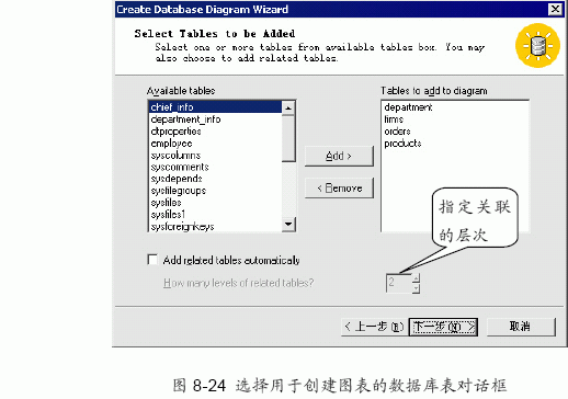 (2) 單擊“下一步”按鈕,即會出現如圖8-24 所示的選擇包含在圖表中的數據庫表對話框,其中選中“add related tables automatically” 選項后,當添加一個表到圖表中時,系統自動將與其有關聯的表添加到圖表中。