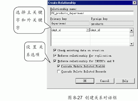 在編輯圖表對話框中,創建表之間的關系特別簡捷,只需從主表中選擇關鍵字段,再按住鼠標右鍵不放直接移動鼠標到從表的相應字段上,松開鼠標即可。例如,創建表orders和表order_firm 之間的關系,作此操作后即會出現如圖8-27 所示的創建關系對話框。在其中可對關系作設置。