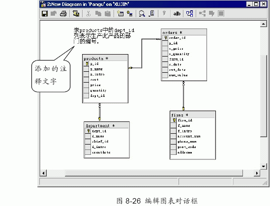 在圖表對象上單擊右鍵,從快捷菜單中選擇“design diagram” 選項,即會出現同圖表創建對話框相似的圖表編輯對話框,可在其中編輯圖表對象,也可以編輯相應的表及其字段、索引、約束和其它屬性等。