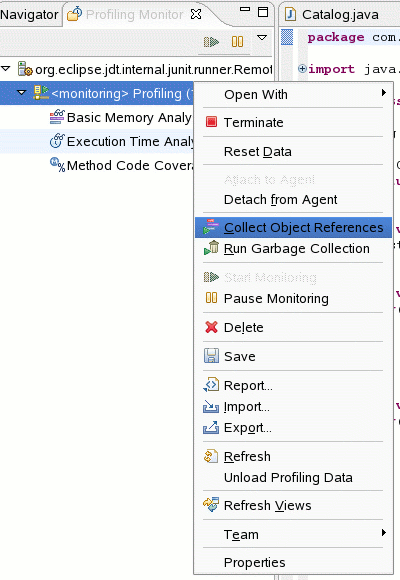 用于檢測內存泄漏的另一個有用工具是object references視圖。為了獲得這些數據,您需要激活引用收集。啟動分析之后,點擊monitoring項,然后在上下文菜單中選擇collect object references(參見圖6)。接下來,通過上下文菜單(open with -> object references)打開object references視圖。您將獲得一個類的列表,它帶有對每個類的引用的次數。這可以為可能的內存泄漏提供一些線索。