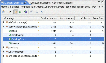 memory statistics視圖顯示了應用程序創建的對象的數量。結果可以按照軟件包來組織(以樹視圖的形式),或者顯示為類或實例的一個列表。這些數據可以讓您了解每種類型創建了多少個對象;應該對創建的對象(特別是高級對象,例如域對象)不正常的高數量持懷疑態度。