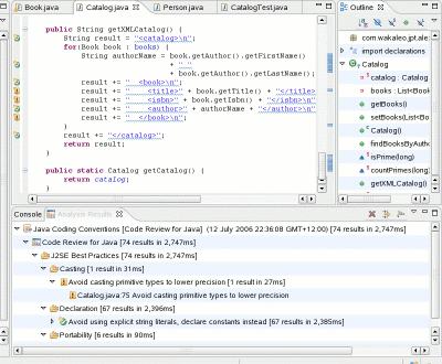 要分析代碼,使用工具欄中的analysis圖標。分析不是實時完成的,就像一些其他的類似工具一樣,例如checkstyle。然而,給出的結果很清晰(參見圖10):錯誤在源代碼視圖中標出,并且按照錯誤類型,以樹視圖的形式在analysis results視圖中列出。"quick fix"是一項優雅的特性,它出現在錯誤類型的上下文菜單中,而且如果可能,它可以自動為您糾正問題。