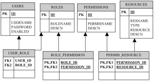 圖2 acegi安全控制系統(tǒng)數(shù)據(jù)庫設(shè)計