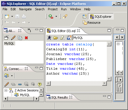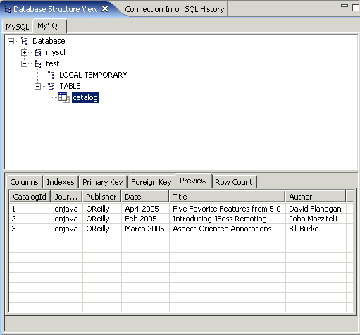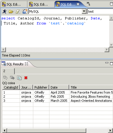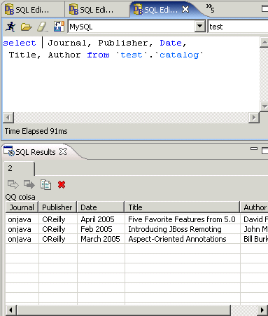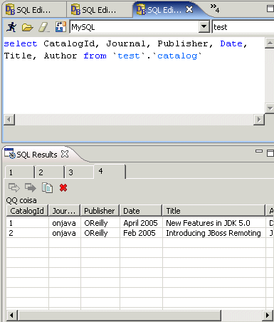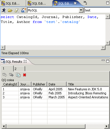 create table catalog(catalogid integer, journal varchar(25), publisher varchar(25), date varchar(25), title varchar(45), author varchar(25)); insert into catalog values('1', 'onjava', 'oreilly', 'april 2005', 'five favorite features from 5.0', 'david flanagan'); insert into catalog values('2', 'onjava', 'oreilly', 'feb 2005', 'introducing jboss remoting', 'john mazzitelli'); insert into catalog values('3', 'onjava', 'oreilly', 'march 2005', 'aspect-oriented annotations', 'bill burke');