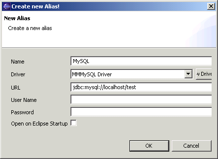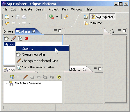 想要連接到 mysql 數據庫并提取其中的表格,我們需要為連接建立一個別名。一個連接的別名說明了連接設置,jdbc 驅動,url,用戶名和密碼。在sqlexplorer視窗中選擇 aliases 標簽。單擊 “create new alias” 按扭來創建一個新的別名,如圖7所示。