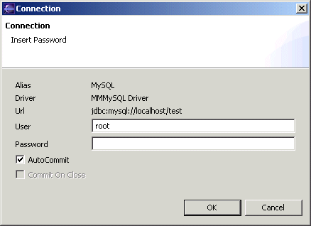 在 connection 框中,指定登陸到 mysql 數據庫使用的用戶名和密碼,然后單擊 ok 按扭。圖11展示了登陸的設置。缺省情況下,對于 root 用戶不需要密碼。