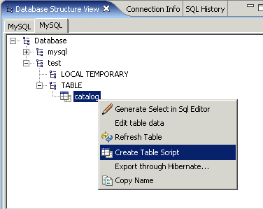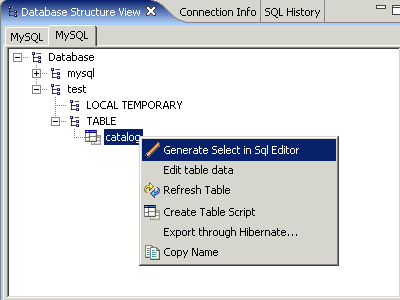 在 eclipse 的 sqlexplorer 視窗中選擇 database structure view 標簽。為了顯示表 catalog 的結構,在 database structure view 中選擇 database>test>table>catalog 結點。圖13顯示了表 catalog 的結構。