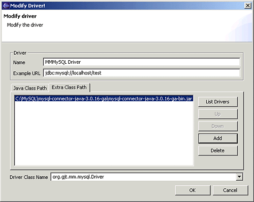 在 modify driver框中,選擇 extra class path 標簽,并且單擊 add 按扭將 mysql 驅動 .jar 文件(為下載的 connector/j 的一部分)添加到類路徑中。圖5闡明了將mysql 的 jdbc 驅動加到 eclipse 的類路徑中。