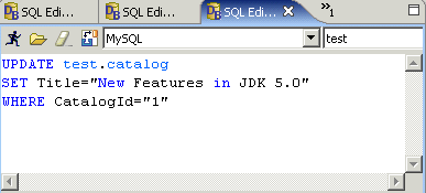 接下來,sql editor 中的一條 sql 腳本將會更新表 catalog。例如,把標題“five favorite features from 5.0”修改為“new features in jdk 5.0”。如圖20所示,在 sql editor 中運行更新表 catalog 的腳本