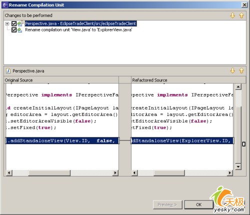 1. 讓我們重命名它-右擊package explorer中的view.java。轉(zhuǎn)到refactor->rename,輸入新名為explorerview并且點(diǎn)擊preview。在隨后彈出的面板上,你會(huì)看到perspective類被重構(gòu)-使用explorerview.id來代替view.id(見圖6)。點(diǎn)擊ok。