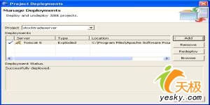 確保在列表下的工程是stocktradeserver。點(diǎn)擊add,選擇tomcat 5作為你的服務(wù)器,并且點(diǎn)擊finish。當(dāng)你看到一條消息"successfully deployed"時(shí),點(diǎn)擊ok(見圖16)。