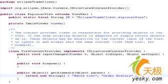 5. 現(xiàn)在讓我們改變結(jié)點(diǎn)的名字。打開類explorerview。找到內(nèi)部類viewcontentprovider,并且改變方法"object getelements(object parent)",讓其返回一個(gè)字符串?dāng)?shù)組({"watch list","order history"})。