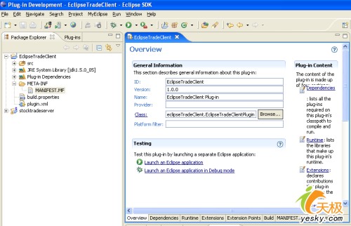 如果你是eclipse插件開發(fā)的新手,你可能經(jīng)常需要使用底部的plugin.xml選項(xiàng)卡。正如你從overview選項(xiàng)卡中所看到的,你可以運(yùn)行/調(diào)試你的eclipse豐富的客戶端應(yīng)用程序。