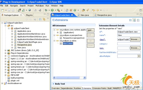 請(qǐng)注意一下你的application類,perspective類和view類的擴(kuò)展入口。既然eclipse的豐富的客戶端平臺(tái)包括plugin.xml文件,所以你可以簡(jiǎn)單地添加新的組件-通過"extensions"選項(xiàng)卡中的"add..."按鈕來添加它們。