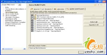 3. 在eclipse的包資源管理器中,右擊springclient以打開工程屬性。選擇"java build path",點(diǎn)擊"libraries"選項(xiàng)卡,并且把剛才你通過按鈕"add jars"添加的所有的那些jar文件加入。請(qǐng)確保你也導(dǎo)入了這些庫!點(diǎn)擊"order and export"選項(xiàng)卡,并且檢查所有的庫(見圖9)。通過這樣做,你就可以確保,當(dāng)你創(chuàng)建對(duì)springclient的一種工作依賴性時(shí),spring和log jars也是可用的。此后,點(diǎn)擊ok。