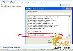 8. 最后,添加依賴性以實(shí)現(xiàn)工程eclipsetradeclient依賴于你的新插件工程springclient。在工程eclipsetradeclient中,打開plugin.xml并且點(diǎn)擊"dependencies"選項(xiàng)卡。在"required plug-ins"節(jié)中,點(diǎn)擊add,選擇"springclient(1.0.0)",并且點(diǎn)擊ok(見圖12)。
