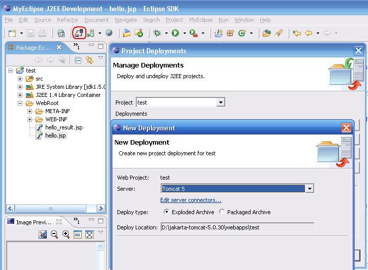 點(diǎn)擊 deploy 按鈕(用紅線畫了的按鈕就是 deploy 按鈕), 在彈出的窗口中點(diǎn)擊add, 部署test項(xiàng)目(如圖所示)。