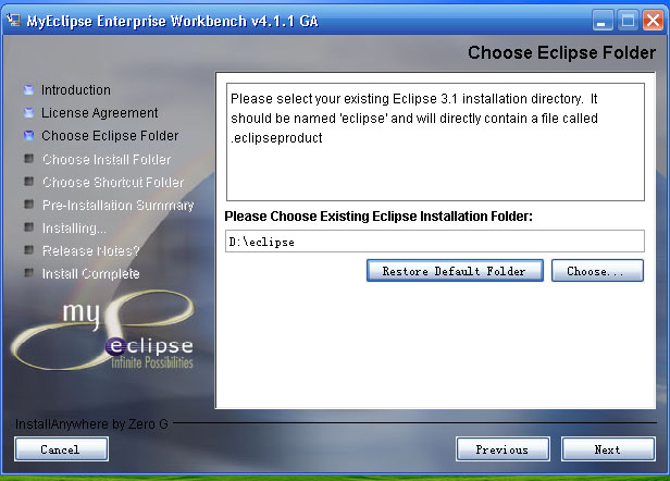 然后安裝enterpriseworkbenchinstaller_4.1.1ga_e3.1.exe。注意:當(dāng)安裝到下圖所示的步驟的時候要選擇eclipse的安裝路徑(如圖),其他選項(xiàng)保持默認(rèn)。