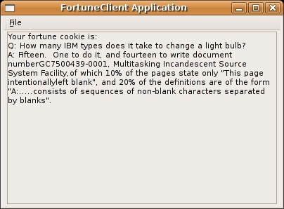 @serviceable public class view extends viewpart {     public static final string id = "fortuneclient.view";     private ifortunecookie cookie;     @injected(optional = false)     public void setdate(ifortunecookie cookie) {         this.cookie = cookie;     }     public void createpartcontrol(composite parent) {         label l = new label(parent, swt.wrap);         l.settext("your fortune cookie is:/n" + cookie.getmessage());     }     public void setfocus() {     } }  注意這里出現(xiàn)了serviceable和injected注釋?zhuān)糜诙x依賴(lài)的外部服務(wù),并且沒(méi)有引用任何服務(wù)代碼。最終結(jié)果是,createpartcontrol() 可以自由地使用cookie對(duì)象,可以確保它被正確地初始化。示例程序如圖3所示
